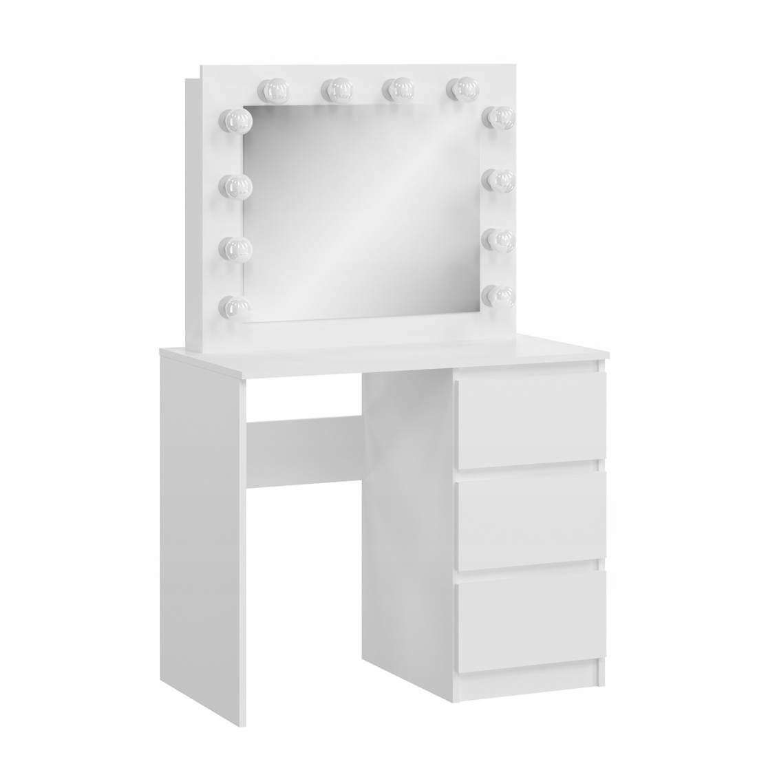 Nasza nowa Biała Toaletka została zaprojektowana z myślą o funkcjonalności i elegancji. Po prawej stronie znajdują się trzy pojemne szuflady, idealne do przechowywania kosmetyków i drobnych akcesoriów. Zastosowane prowadnice rolkowe zapewniają płynne i ciche otwieranie szuflad.