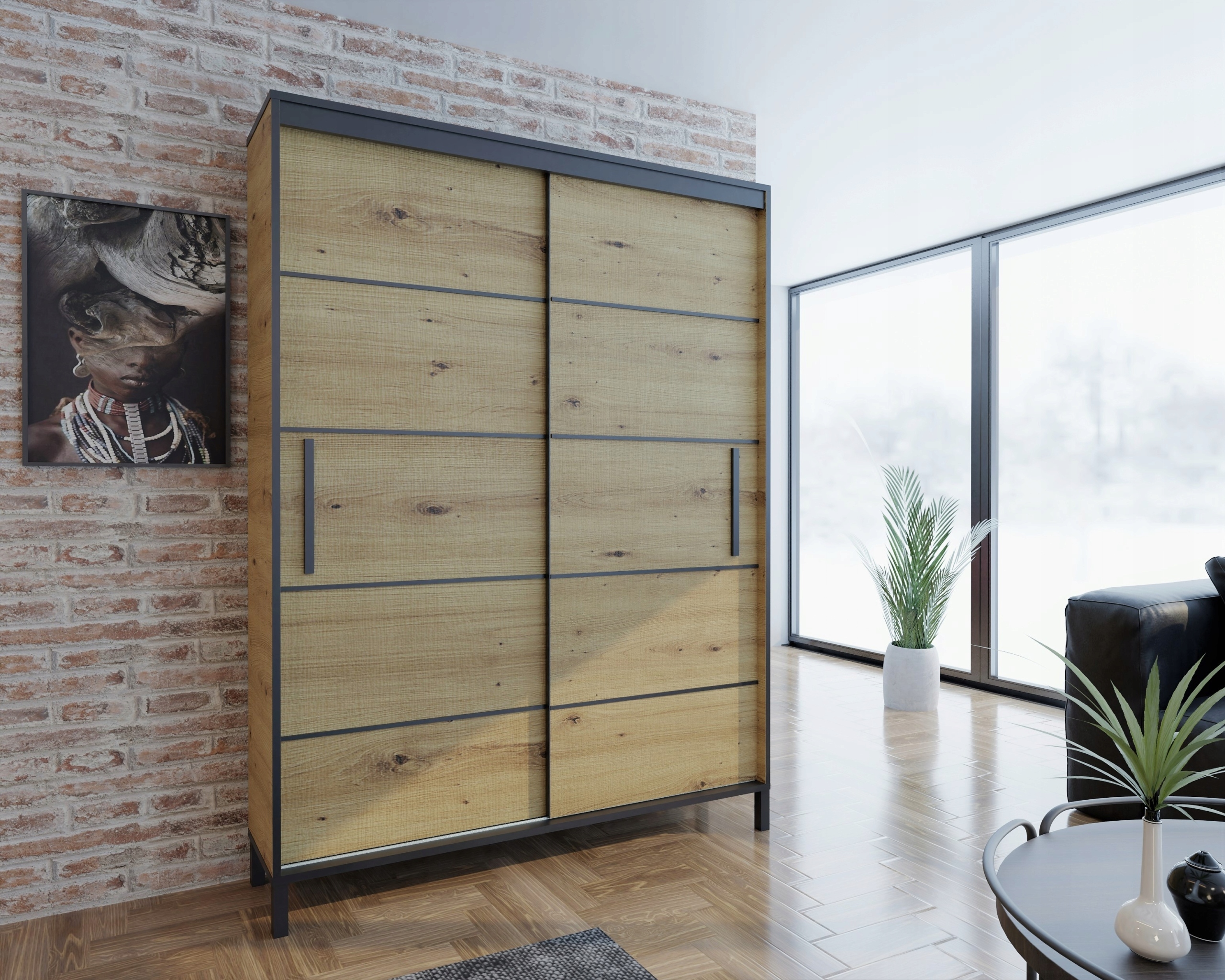 Odkryj minimalistyczną elegancję komody, która doskonale łączy funkcjonalność z nowoczesnym stylem. Wykonana w modnej kolorystyce, łączy ciepły odcień drewna z czarnymi, industrialnymi akcentami, idealnie pasując do współczesnych wnętrz. System przesuwnych drzwi zapewnia łatwy dostęp do przechowywanych rzeczy, oszczędzając jednocześnie miejsce w pomieszczeniu. Ta komoda to idealne rozwiązanie do sypialni, salonu czy przedpokoju, oferujące zarówno estetykę, jak i praktyczne miejsce do organizacji.