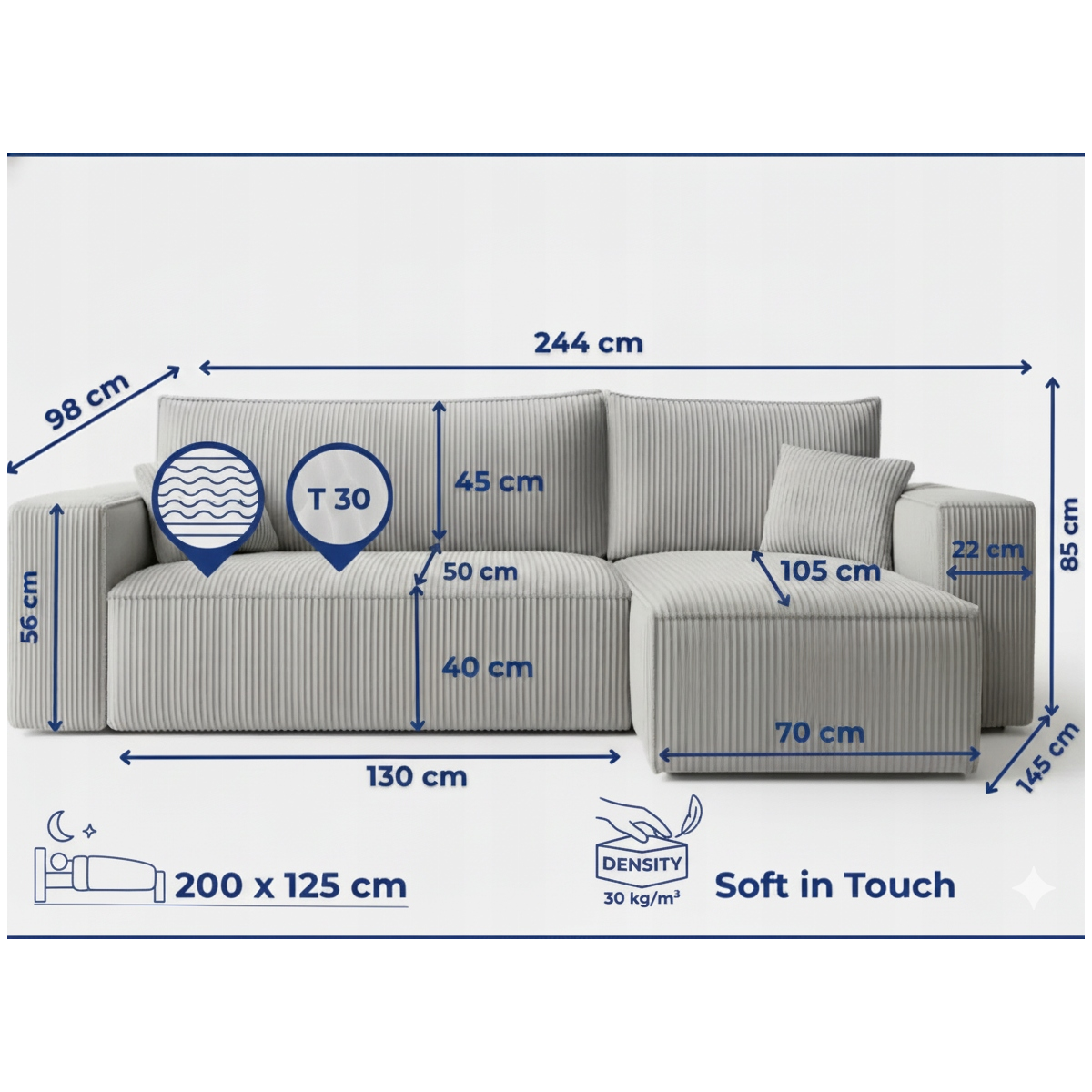 Narożnik z funkcją spania to nowoczesny i komfortowy mebel, który idealnie łączy elegancki wygląd z praktycznym zastosowaniem. Doskonale sprawdzi się w salonie, pokoju dziennym lub pokoju gościnnym, zapewniając wygodne miejsce do odpoczynku w ciągu dnia oraz komfortowy sen w nocy. Starannie wykonany z wysokiej jakości materiałów, dostępny jest w ośmiu modnych odcieniach tkaniny Poso, dzięki czemu z łatwością dopasujesz go do wystroju swojego wnętrza.
