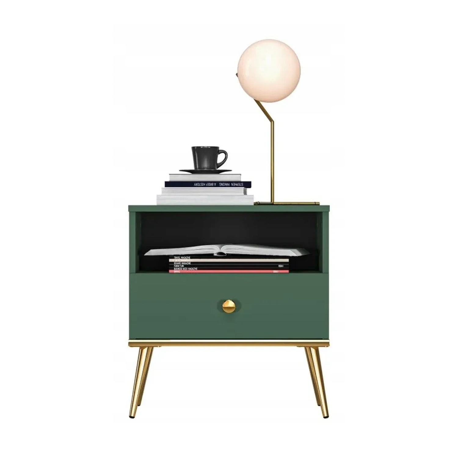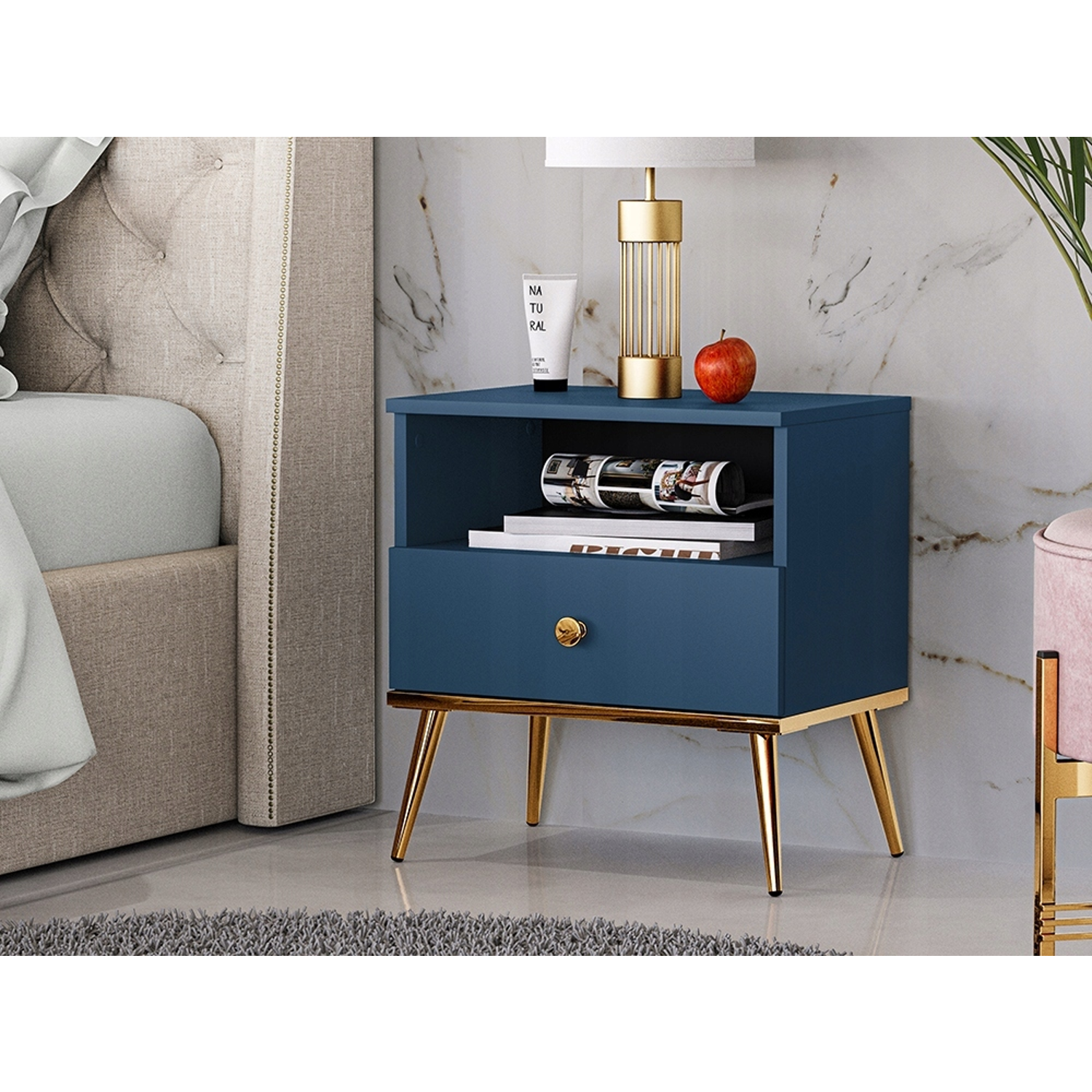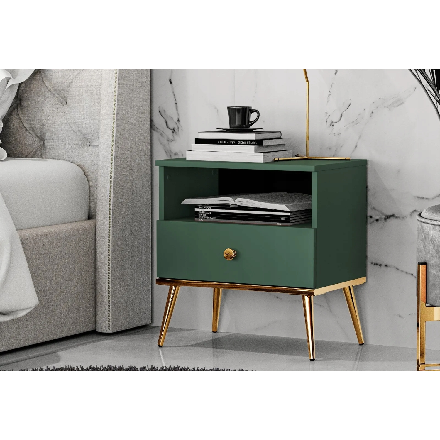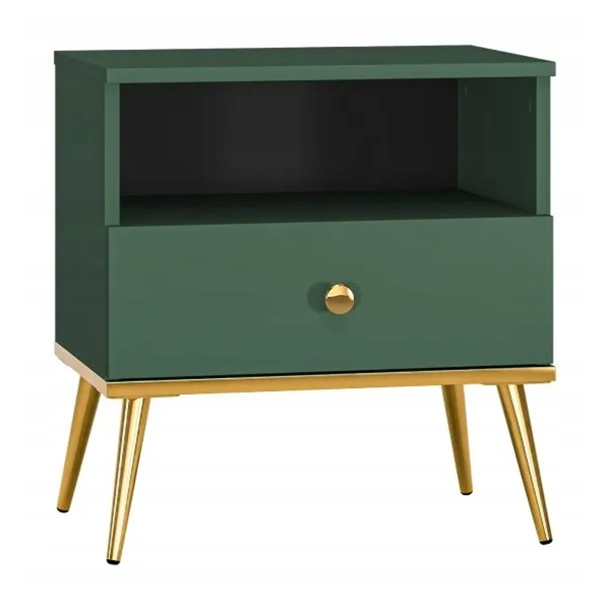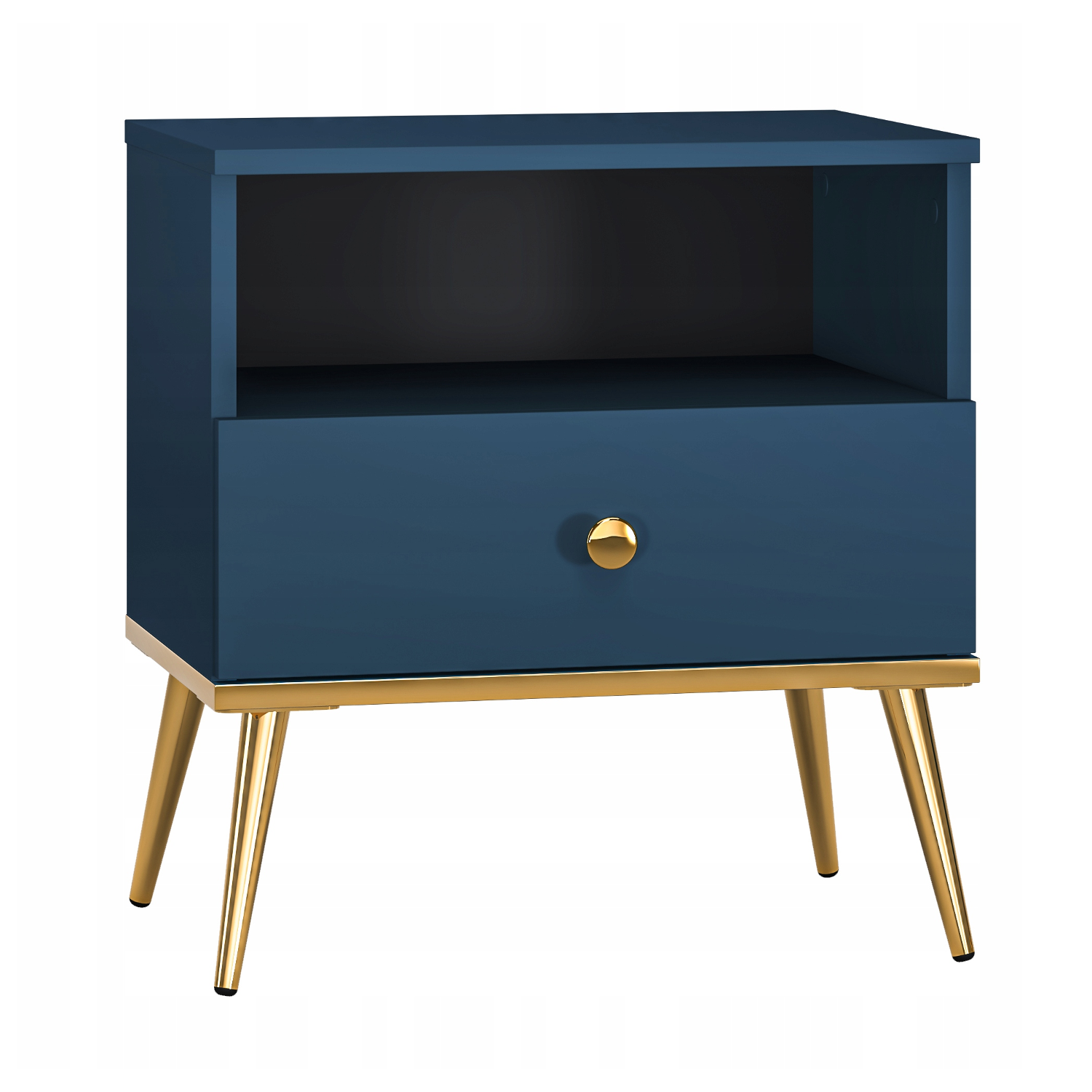- Osadzona na eleganckich złotych, metalowych nóżkach o wysokości 18 cm