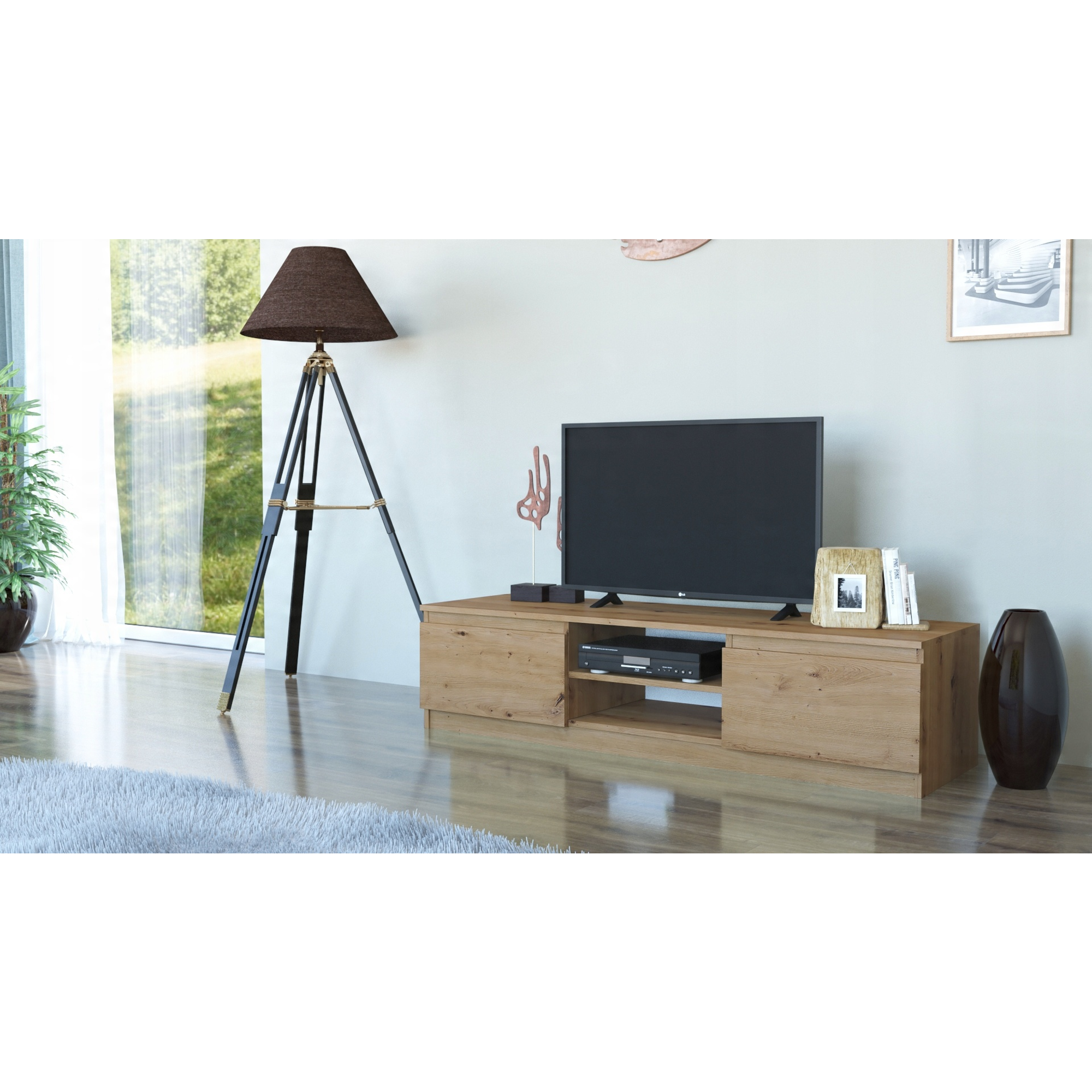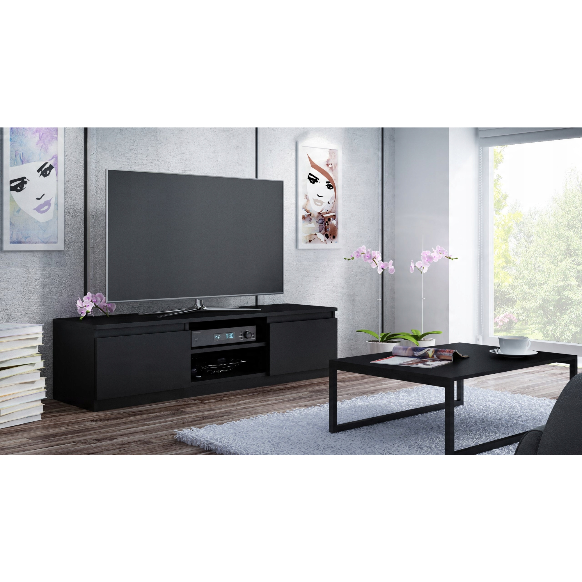 - Otwarta półka pozwala na wygodne ustawienie sprzętu RTV, a umieszczony w jej plecach otwór, ułatwia dyskretny montaż okablowania
