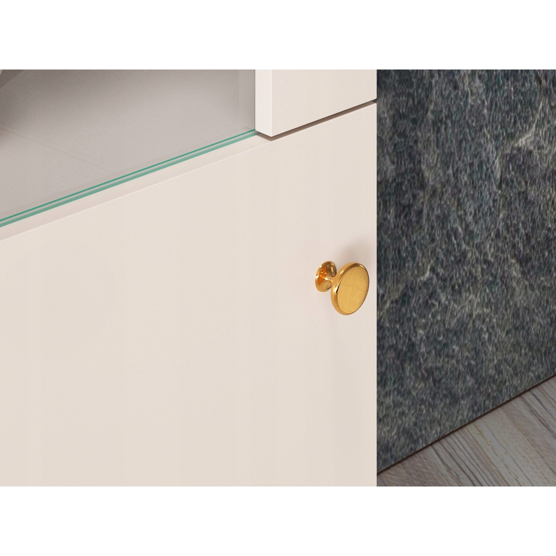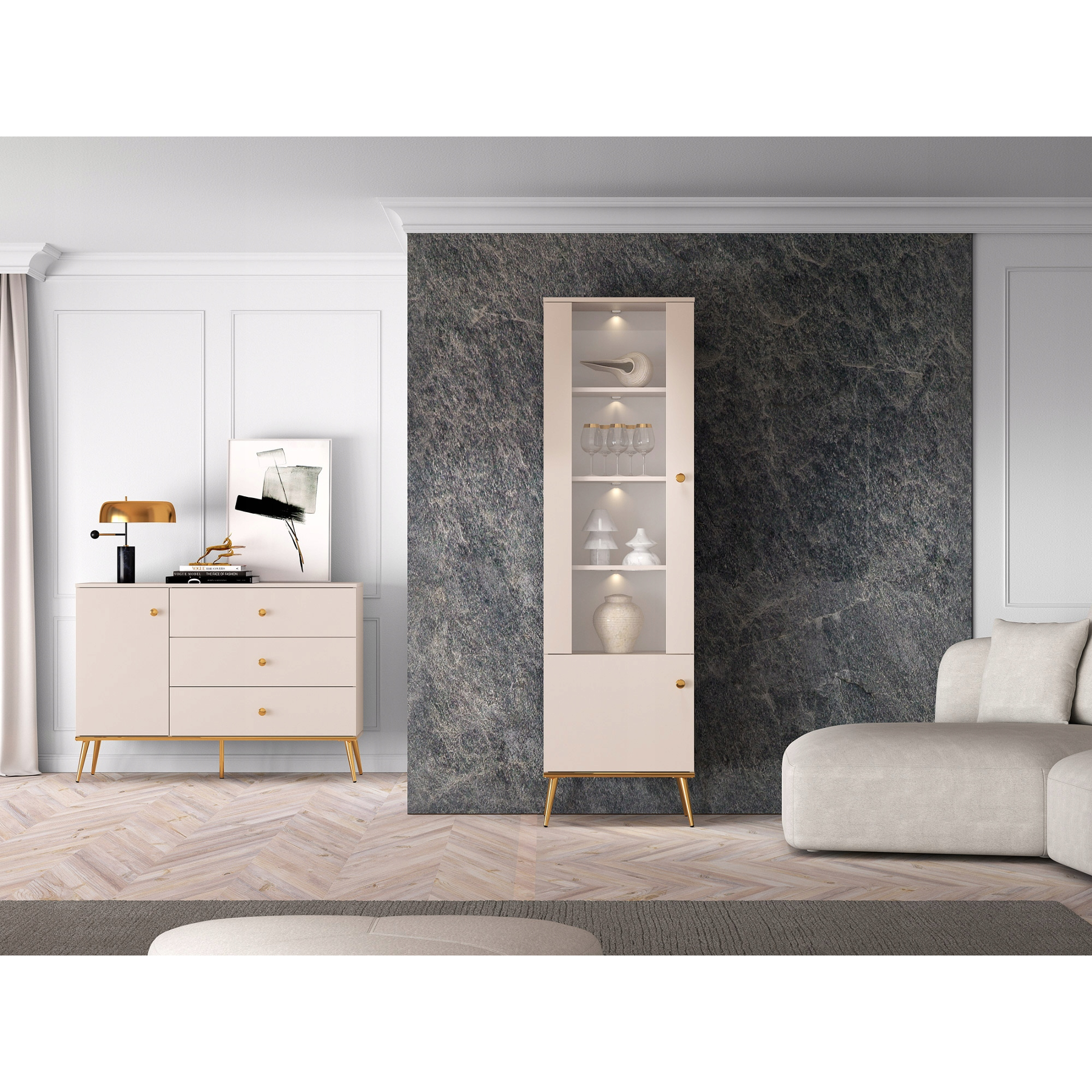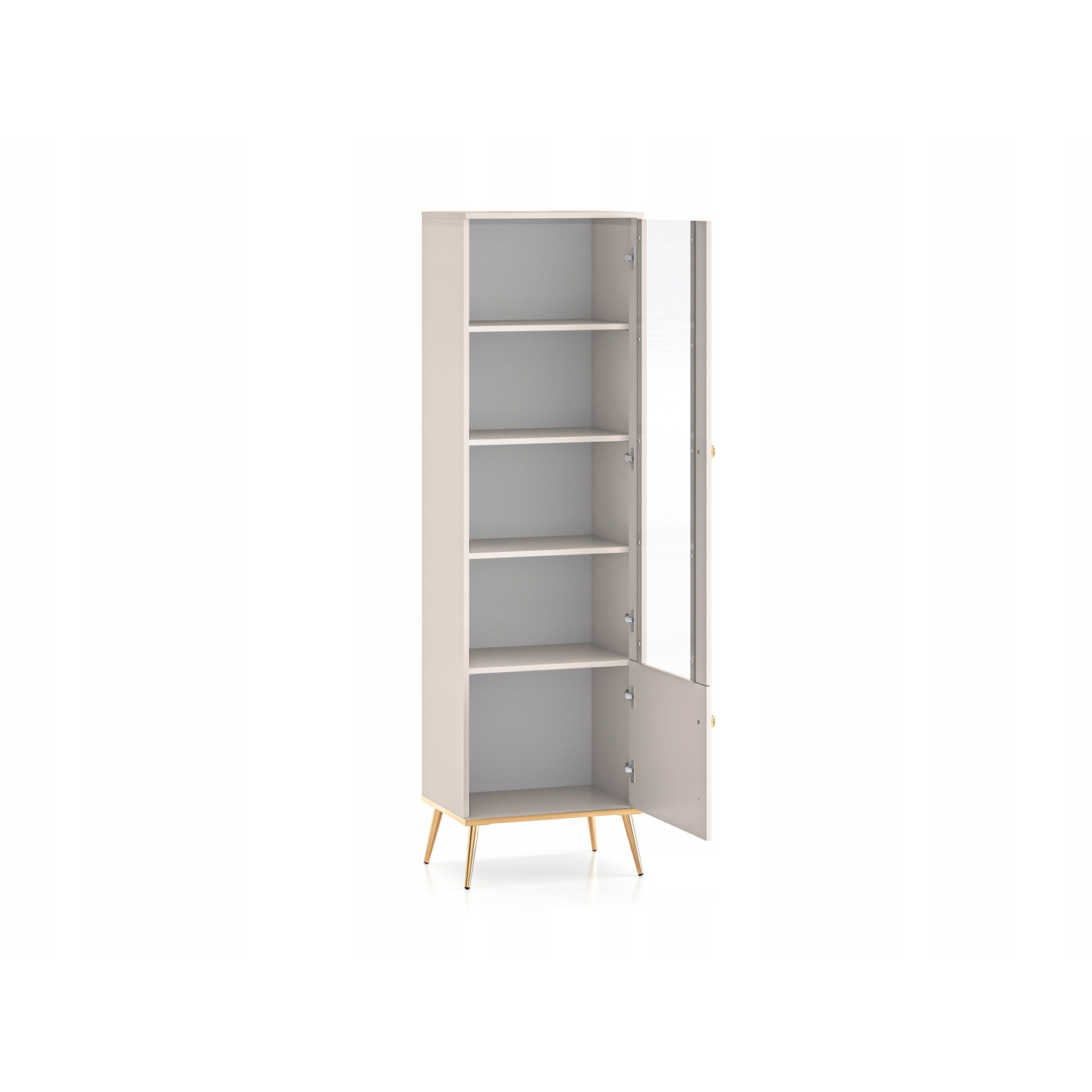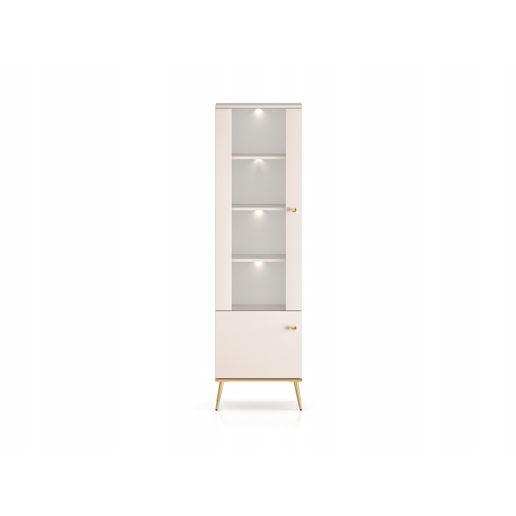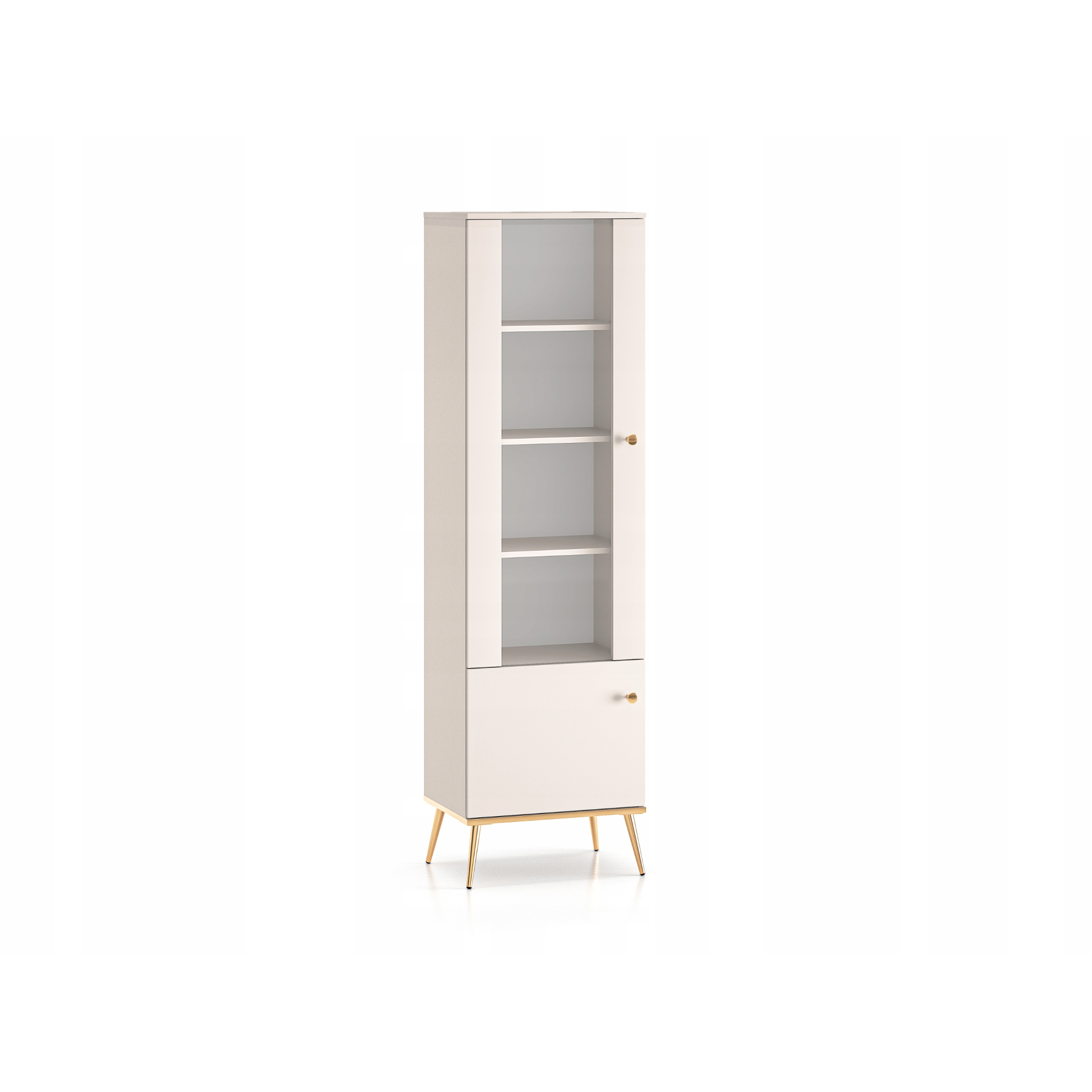 Nasza nowa Witryna z kolekcji Selena to mebel, dzięki któremu wyeksponujesz swoje ulubione przedmioty. Trzy półki dzielą oszkloną przestrzeń na cztery wnęki. Ustawisz w nich kieliszki, kolekcję porcelany lub pamiątki z podróży. Dolną część mebla tworzy zamykana półka, na której przechowasz zastawę stołową lub obrusy. Bryła mebla posadowiona jest na stabilnych, wysokich nóżkach wykonanych z wytrzymałego metalu. Podwójnie galwanizowane uchwyty oraz nogi w złotym wybarwieniu gwarantują wieloletnie, wygodne użytkowanie. Meble z naszej nowej kolekcji łączą w sobie wysoką funkcjonalność z zachwycającym designem.